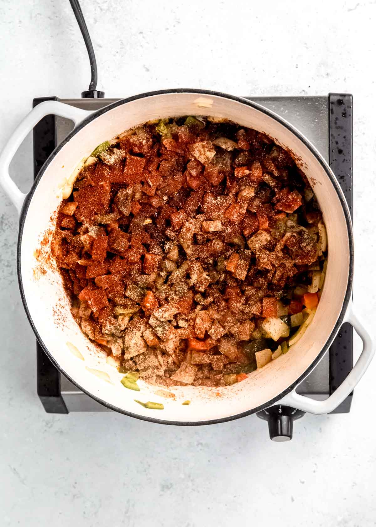 - Add the chili powder, cumin, garlic powder, and smoked paprika. Continue to cook for 1 minute until the spices are fragrant and slightly toasted.