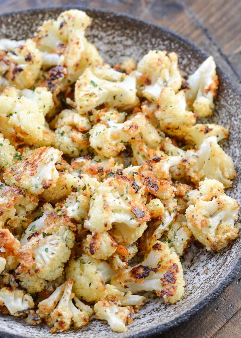 Parmesan Roasted Cauliflower is SO easy and even more delicious! Only 3.5 net carbs per serving (about 3/4 cup), any leftovers you might have make a super flavorful boost in low-carb wraps or salads!