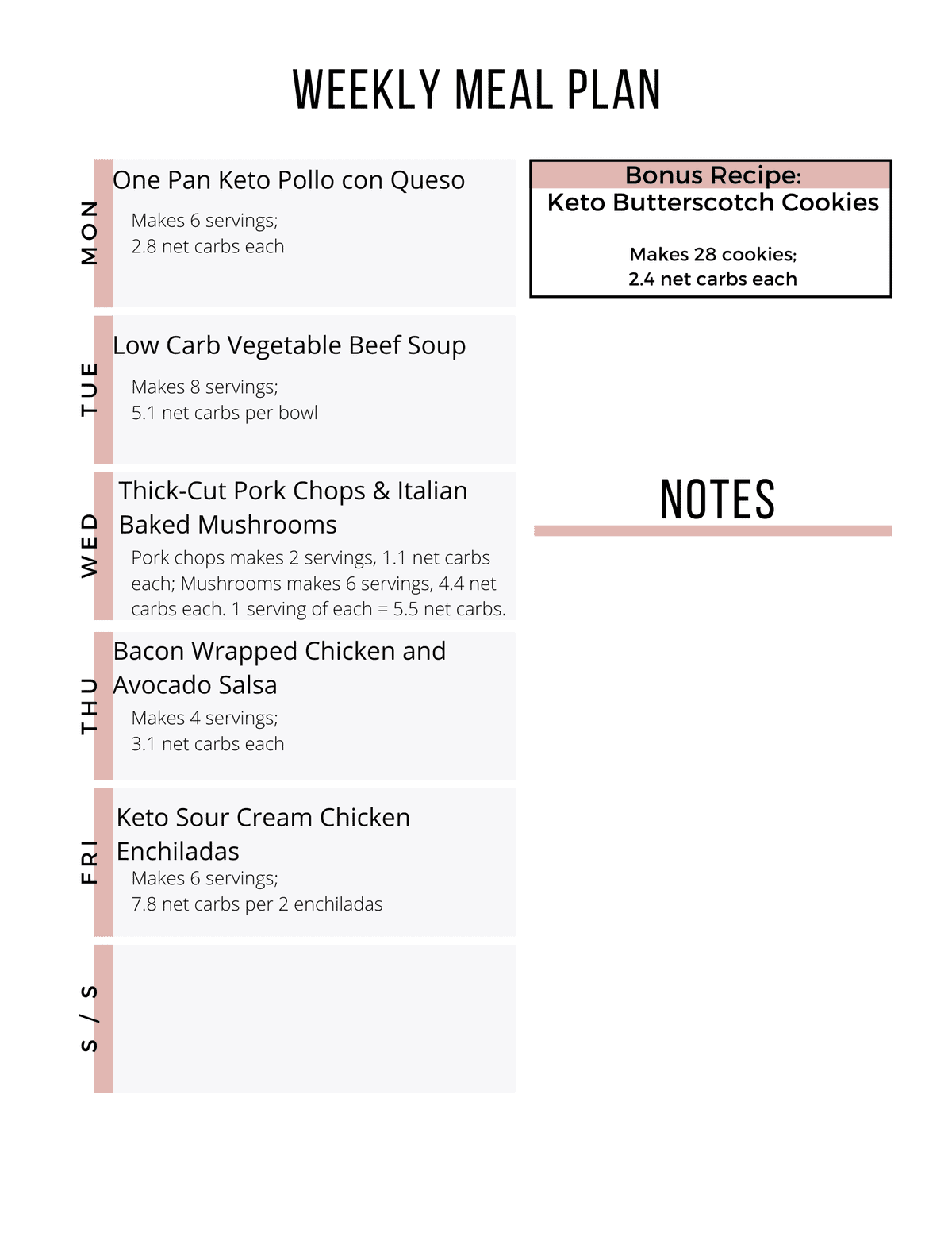 My Easy Keto Meal Plan includes 5 delicious keto dinners as well as an easy low-carb meal prep dessert! Download the printable meal plan and shopping list with net carb counts for an easy week of keto recipes!