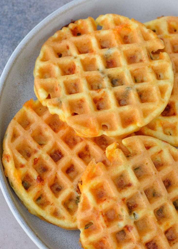 These Jalapeno Cheddar Chaffles are perfect for an avocado toast or sandwiches! This recipe makes 6 cheesy keto waffles at 1.5 a piece. You can make 1-2 batches and enjoy all week for breakfast, lunch, snacks, or side dishes.