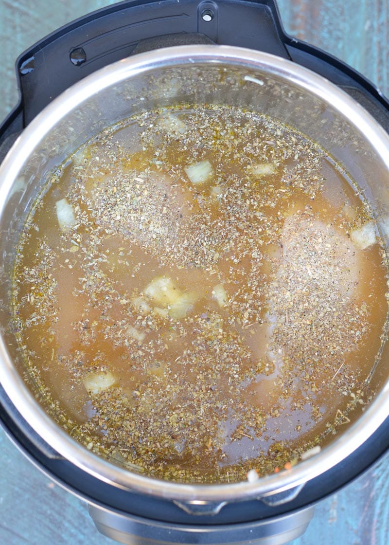 - Add the chicken, spices and broth to the Instant Pot. Secure the lid and set the timer for 12 minutes (OR 6 minutes per pound if you use more than the 2 pounds directed).