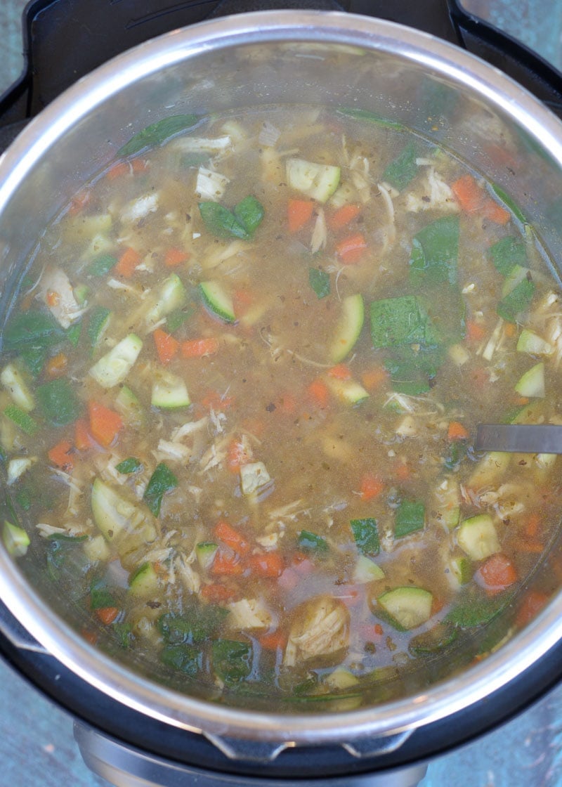 - Release any remaining pressure and open the pressure cooker. Remove the chicken and set aside. Add the thinly sliced zucchini, heavy cream and spinach to the soup, stir well. Place the lid back on the Instant Pot (just to keep the heat in, it will cook the veggies while you shread the chicken)