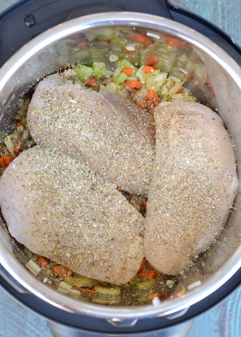 First, turn your Instant Pot to “sauté” and add the olive oil (or butter), celery, onion, carrot and garlic. Sauté 3-4 minutes or until softened. Turn off the sauté function and add the chicken, spices and broth to the Instant Pot. Secure the lid, then set the timer for 12 minutes.