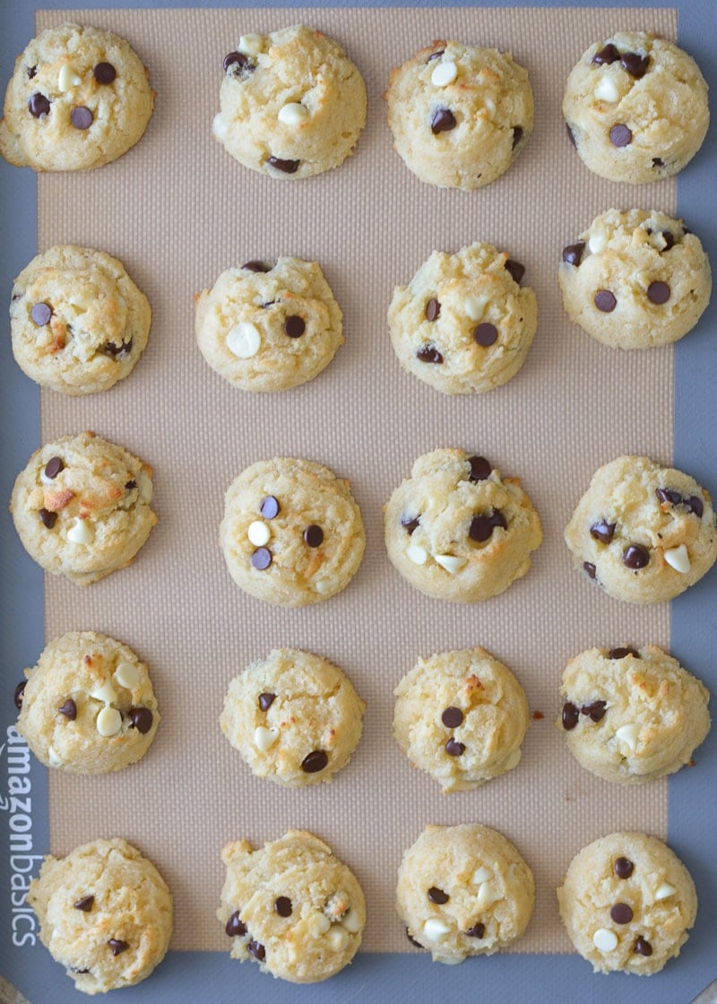 These super easy Keto Cake Mix Cookies require just four ingredients! Each soft and fluffy chocolate chip cookie has about 1 net carb each!