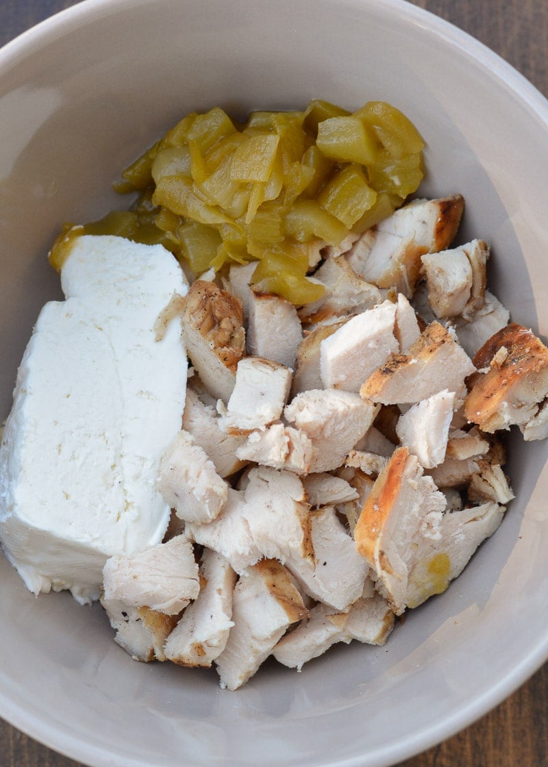 - In a small bowl combine the cooked chicken, cream cheese and green chiles, set aside.