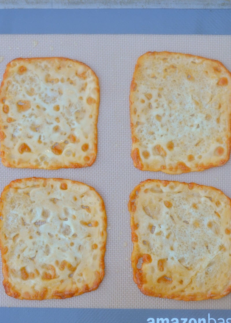 - Place the mozzarella slices on the silicone baking sheet and bake 5-7 minutes or until the edges have begun to crisp.