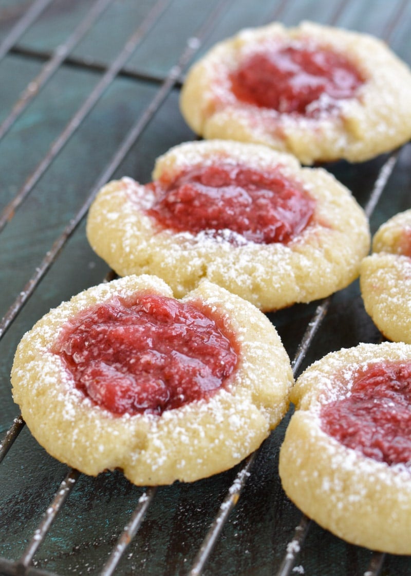 Keto Strawberry Thumbprint Cookies are the perfect sweet treat for about 2 net carbs each! Low carb sugar cookies are packed with fresh strawberry sauce and baked until soft and chewy!