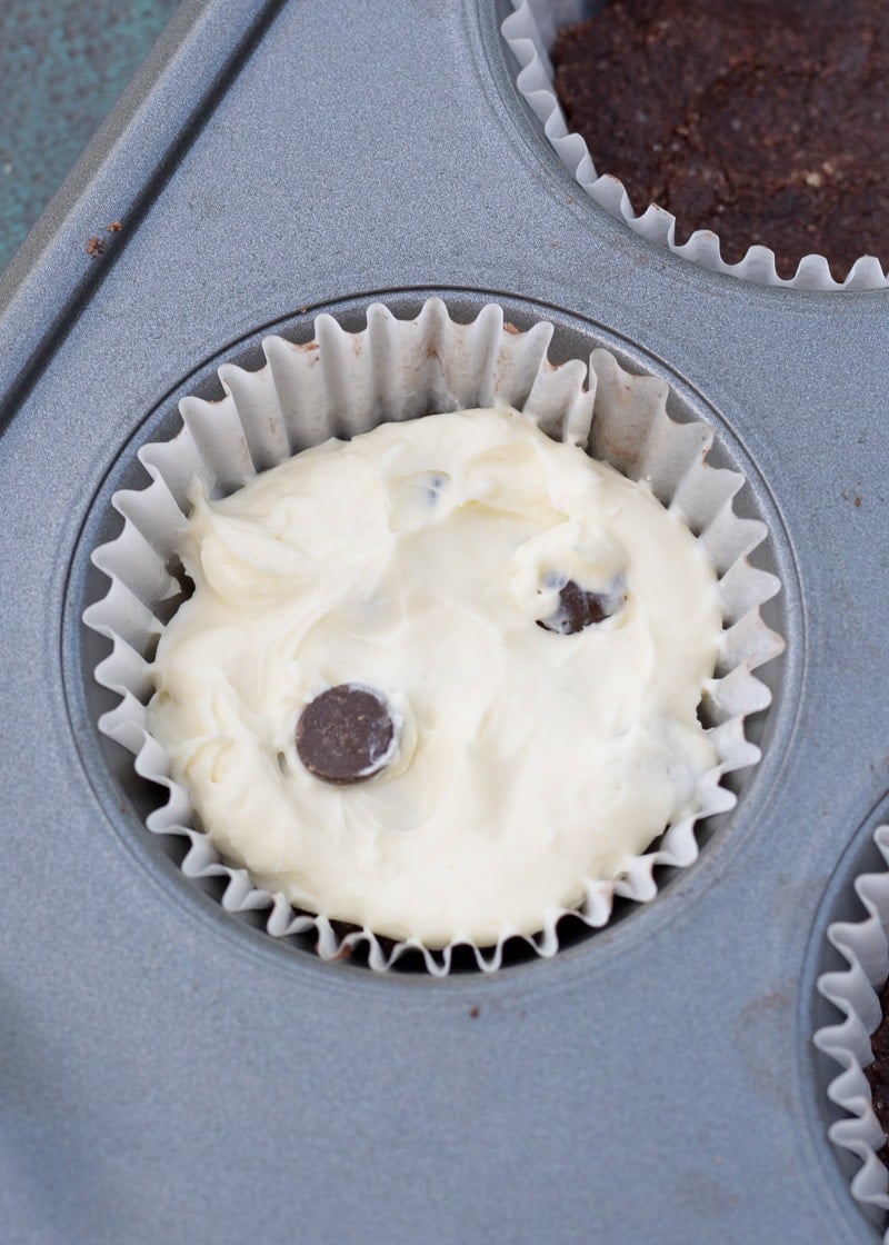 Next, combine your cream cheese, egg, vanilla and powdered sweetener in a bowl and beat together with an electric beater. After your cheesecake filling is well combined, fold in the chocolate chips.
