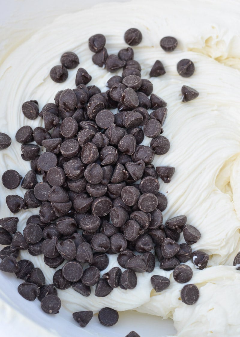 - Combine cream cheese, egg, vanilla, and powdered monkfruit in a bowl and beat with an electric mixer until well combined. Fold in chocolate chips