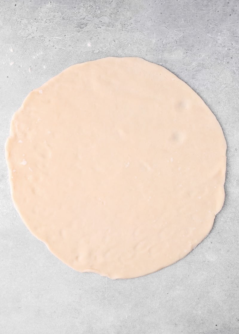 - Spray a baking sheet with cooking spray or line with parchment paper and spread out the pie crust with your hands. Just form a large circle, it doesn't have to be perfect.