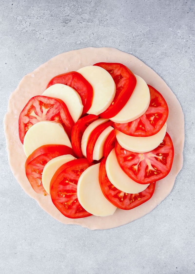 - Top with sliced mozzarella and sliced tomatoes. Add salt and pepper to taste.